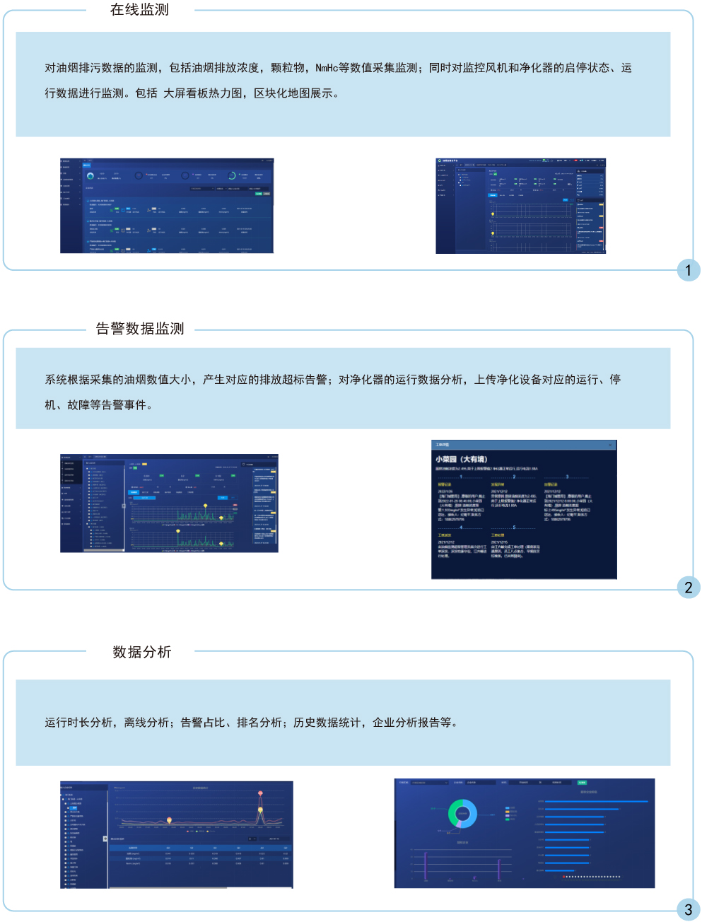 为了弥补现存餐饮行业在烟油监测上的漏洞,同时便利监管部门的监察,安科瑞油烟监测云平台应运而生。油烟监测模块通过2G/4G与云端平台进行通信和数据交互,系统能够对企业餐饮设备的开机状态、运行状态进行监控;实现开机率监测,净化效率监测,设施停运告警,待清洗告警,异常告警等功能;对采集数据进行统计分析、排名等统计功能;较之传统的静电监测方案,更具安全性和实效性。