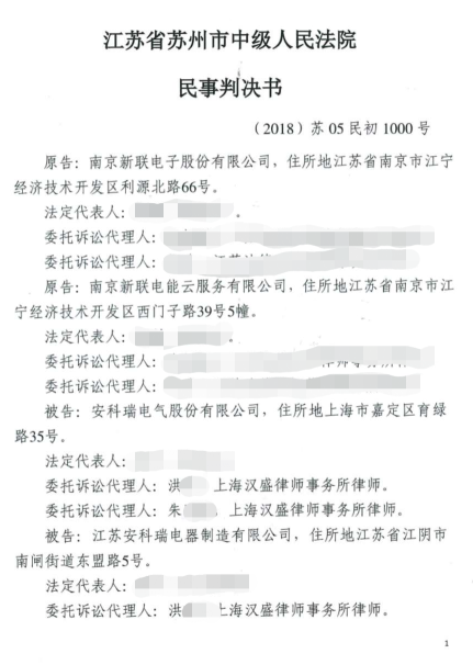 近日安科瑞收到江苏省苏州市中级人民法院(以下简称“苏州中院”)的《民事判决书》((2018)苏 05 民初 1000 号),就原告南京新联电子股份有限公司、南京新联电能云服务有限公司(以下简称“新联公司”)与被告安科瑞电气股份有限公司、江苏安科瑞电器制造有限公司(以下简称“安科瑞”)侵害发明专利权纠纷一案作出判决。