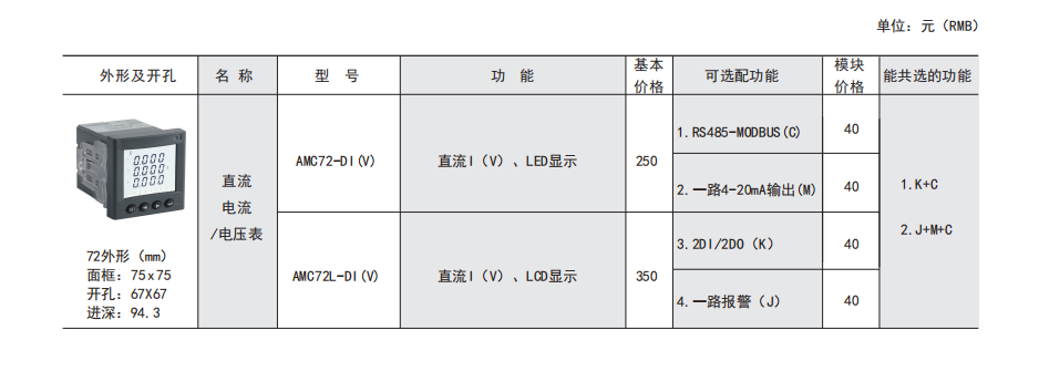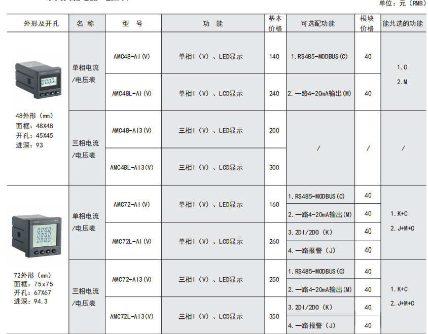 AMC 系列可编程智能电测仪表是针对电力系统、工矿企业、公用设施、智能大厦的电力监控需求而设计的智能仪表,它集成电力参数的测量(如单相或者三相的电流、电压、有功功率、无功功率、视在功率、频率、功率因数)以及电能监测和考核管理。采用高亮度 LED/LCD 显示界面,通过按键来实现参数设置和控制,非常适用于实时电力监控系统。可以直接取代常规电力变送器及测量仪表。作为一种智能化、数字化的前端采集元件,该仪表已广泛应用于各种控制系统、SCADA 系统和能源管理系统中。