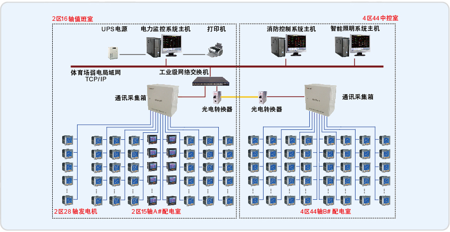 体育场变配电系统60kV以上部分由赞方提供,低压系统主要变电设备为4台1600kW干式变压器和一台1600kW应急柴油发电机,分别位于2区15轴、2区28轴和4区44轴配电室的内,共27台低压配电柜,116个配电回路。本电力监控系统为三层结构,现场设备层由安装在低压配电柜上的多功能仪表组成,经由9根RS485总线上传数据。通讯管理层由安装在15轴监控室和44轴B#配电室通讯机柜内的通讯服务器、光电转换器和工业以太网交换机等设备组成,其功能是连接现场设备层和站控管理层。站控管理层设备(监控主机、UPS电源、显示器等)均安装在15轴监控室的通讯采集箱内。