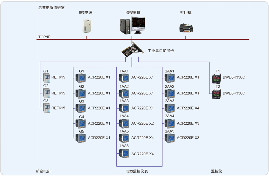 安科瑞电气股份有限公司于2011年8月承接了苏州轴承厂有限公司电力监控系统的设计与实施。本监控系统主要实现苏州轴承厂有限公司的10/0.4kV配电系统进行用电监测与电能管理;监测范围为新建变电所的T1、T2变压器进线柜,联络柜,温控仪,高压侧仪表及综保进行远程实时监控和电能管理。该系统总计有31只仪表(其中包括26只ACR220E,3只ABB,2只温控仪),分3条总线,都是直接通过屏蔽双绞线走管道拉至值班室连接到主机扩展卡上,实现总线上仪表与监控主机的数据连通。