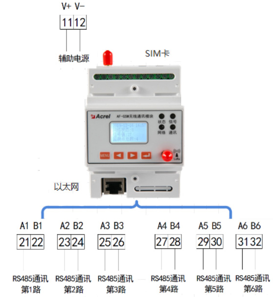 本产品提供标准RS485数据接口,可以方便的连接RTU、PLC、工控机等设备,仅需一次性完成初始化配置,就可以完成对MODBUS设备的数据采集,并且与安科瑞服务器进行通讯。