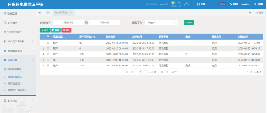 减排方案录入:根据减排计划录入减排方案,支持应急预案的启动。