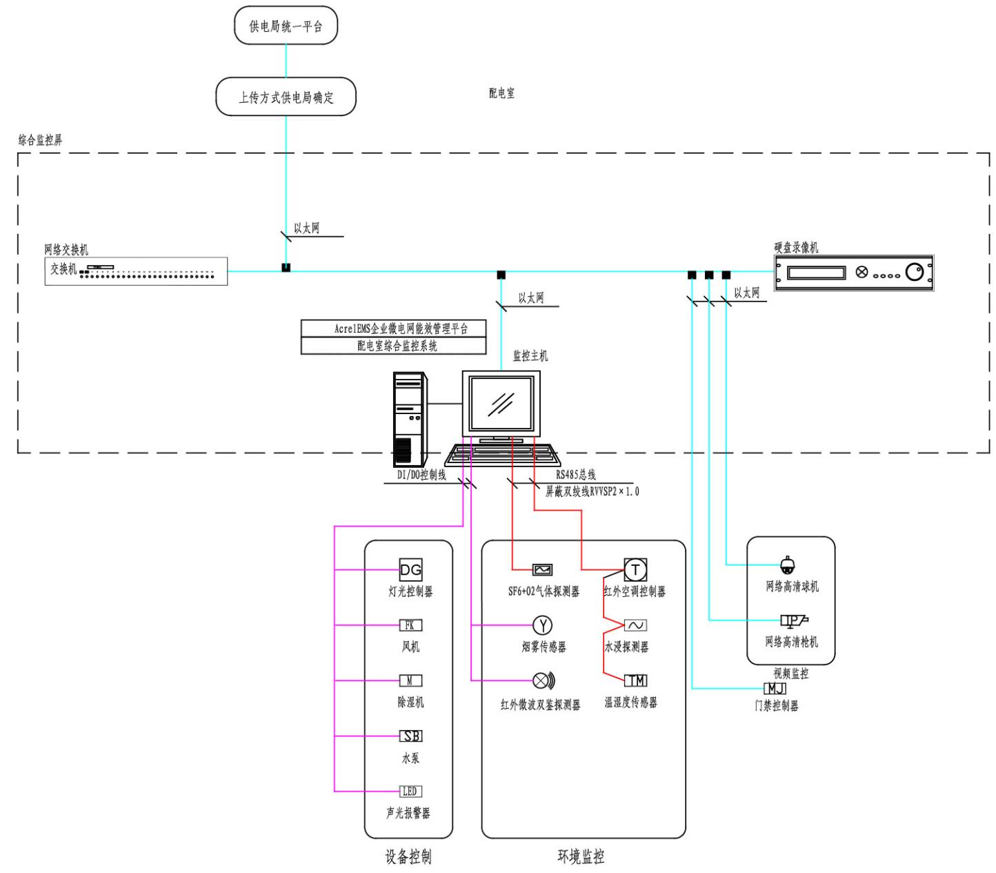 配电室综合监控系统包括智能监控系统屏、通讯管理机、UPS电源、视频监控子系统(云台球机、枪机)、环境监测子系统(温度、湿度、水浸、烟感)、控制子系统(灯光、空调、除湿机、风机、水泵)、门禁监控子系统(读卡器、开门按钮、磁力锁)、安防监控子系统(双鉴检测器)。