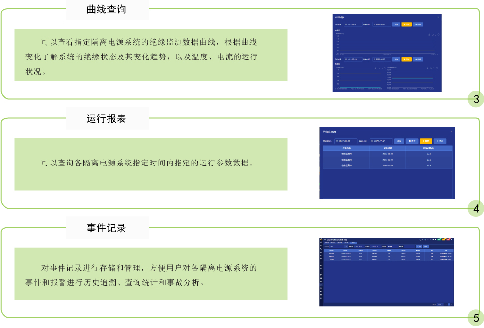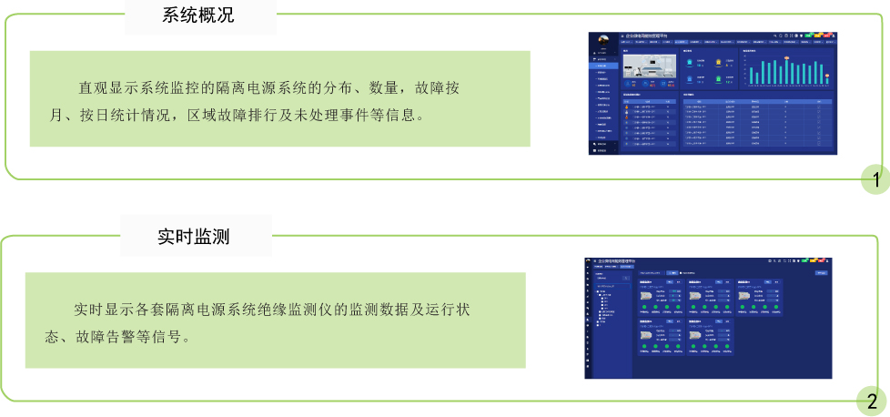 适用于医院的手术室、各类重症监护室、抢救室、血透中心、内窥镜室及造影室等医疗2类场所的医用隔离电源系统的远程监控及自动化管理。
