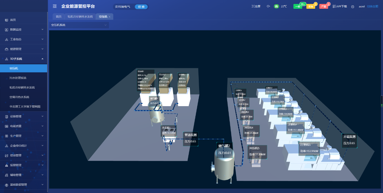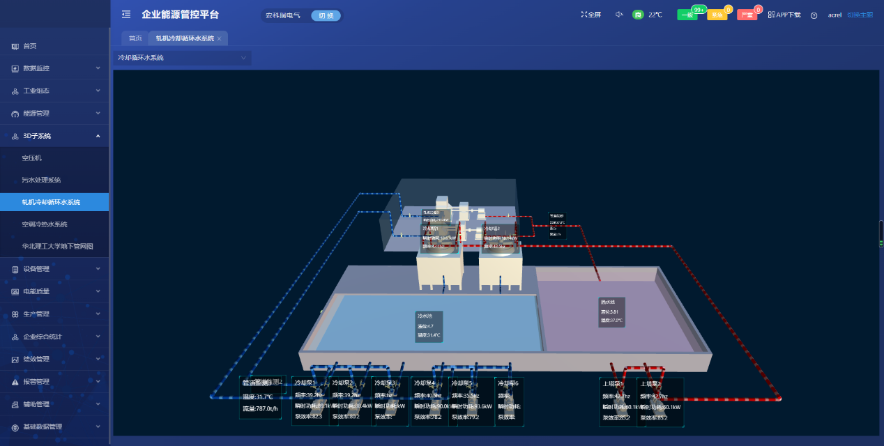 采集厂内制冷系统、循环冷却水系统、空压机系统、污水处理系统等运行数据,可对运行能效数据、历史数据、实时数据、累计电量、功率、分时段(年、月、周、日)电量及功率进行展示对比分析。