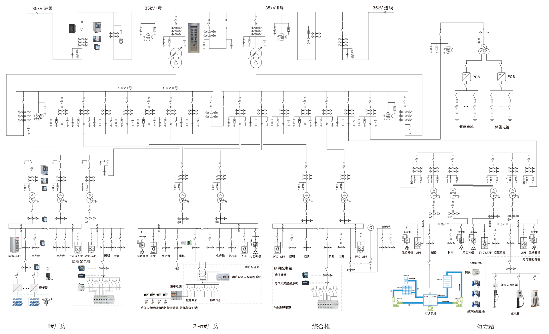 电力监控系统主要针对园区变电站、开闭所和10/0.4kV配电房,对电源进线配置电能质量监测装置实时监测进线电能质量,包括电压闪变、跌落、电压合格率等数据生成电能质量分析报告。高压回路配置微机保护装置进行保护和监控,对配电房0.4kV出线配置多功能计量仪表,用于测控出线回路电气参数和用能情况。同时对变电站(所)内重要设备如柴油发电机、无功补偿装置、有源滤波装置、状态进行监测。