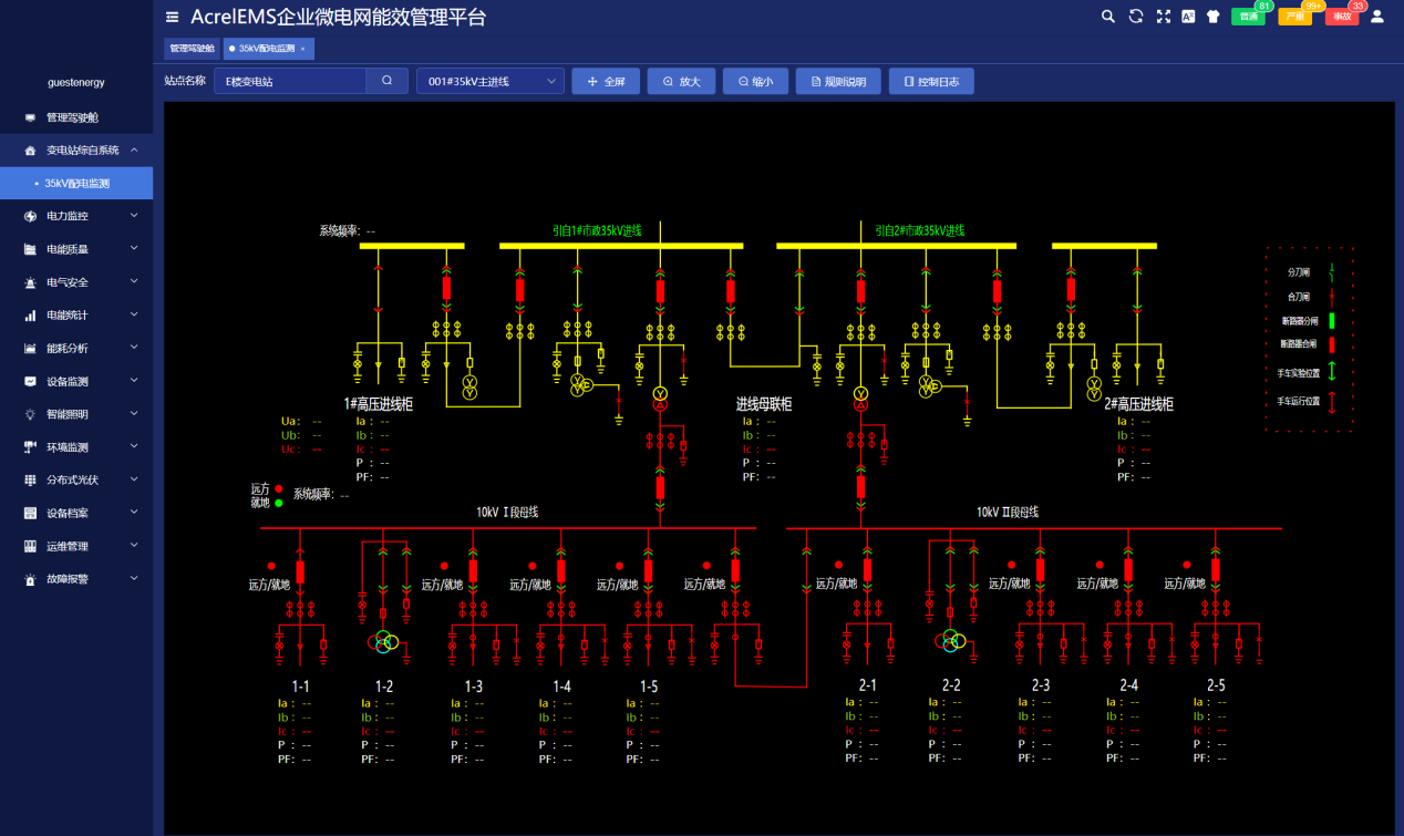 系统人机界面友好,以配电一次图的形式直观显示配电线路的运行状态,实时监测各回路电压、电流、功率、功率因数、电能等电参数信息,动态监视各配电回路断路器、隔离开关、地刀等合分状态、柴油发电机状态、柴油液位、UPS状态、电池信息等,以及有关故障、告警等信号。