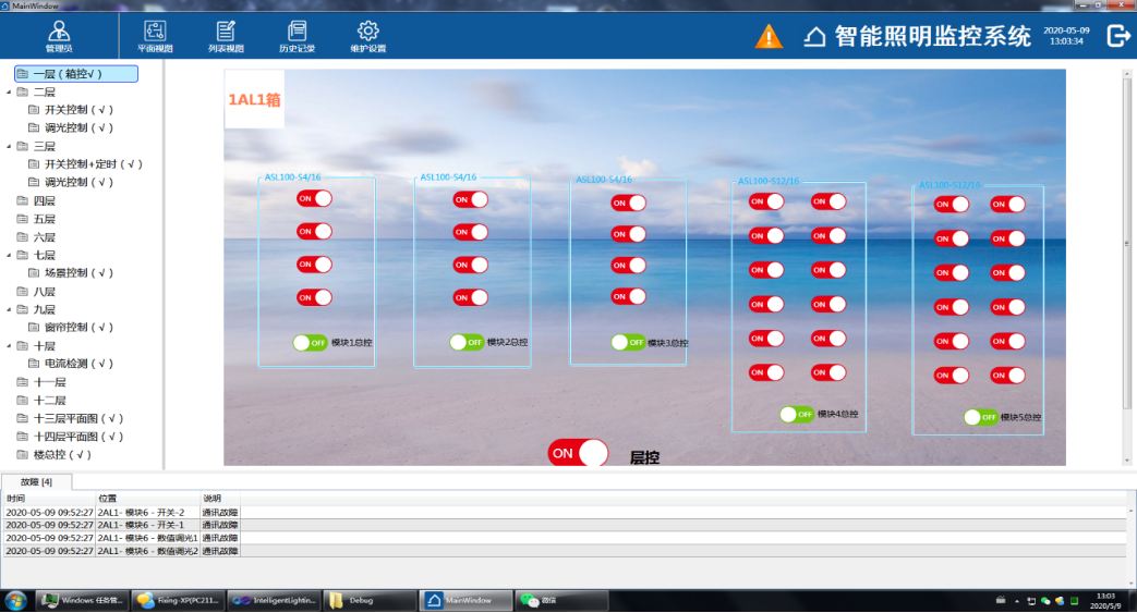 2)当发生模块离线、网关设备掉线或者状态反馈和下发控制命令不一致时会发生故障报警,并将故障报警信息记录并显示在界面中。