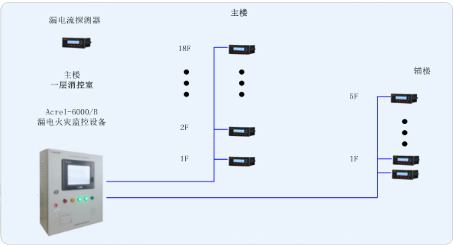 针对本项目的性质及配电结构,现针对其主楼(18层)、辅楼(5层),两栋楼设计一套电气火灾监控系统。在主楼和辅楼的楼层配电箱的进线端安装漏电流探测器,由此来实时监测变电所内重要回路的漏电流,以确保变电所配电系统的电气安全。