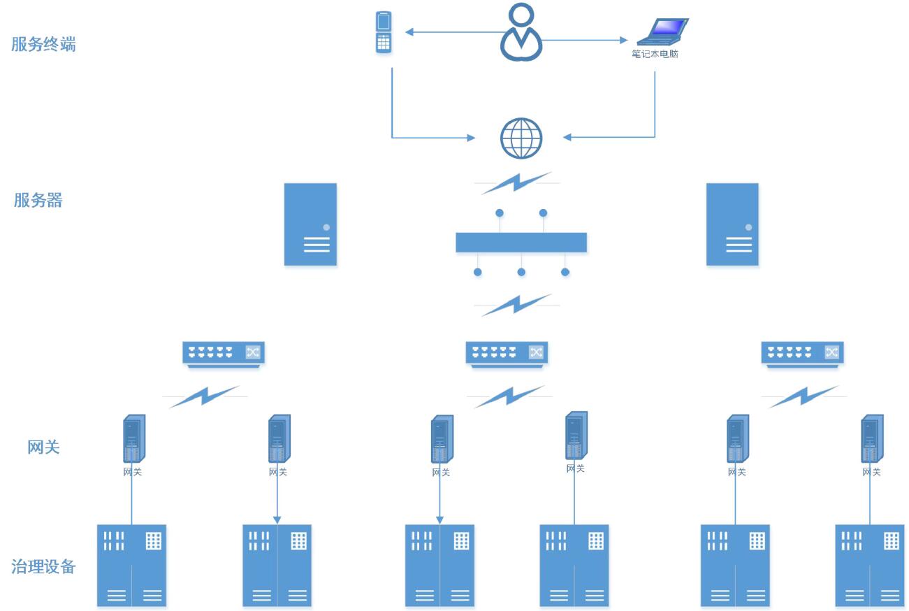 电能质量分析与治理系统平台主要由电能质量治理设备、物理网关、服务器及服务终端四部分组成,其中电能质量治理设备作为基础实现对数据采集与电能质量补偿等具体服务动作,物理网关实现设备与服务器间的数据传输以及对设备进行策略功能分配,数据经由服务器最终以服务终端为媒介为用户提供可视化展示。