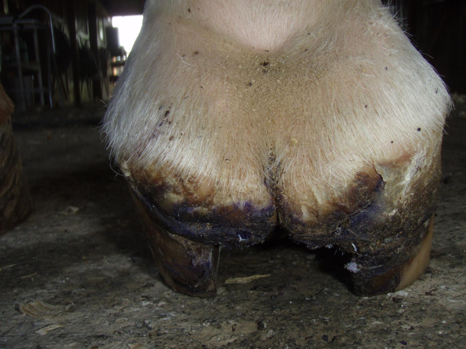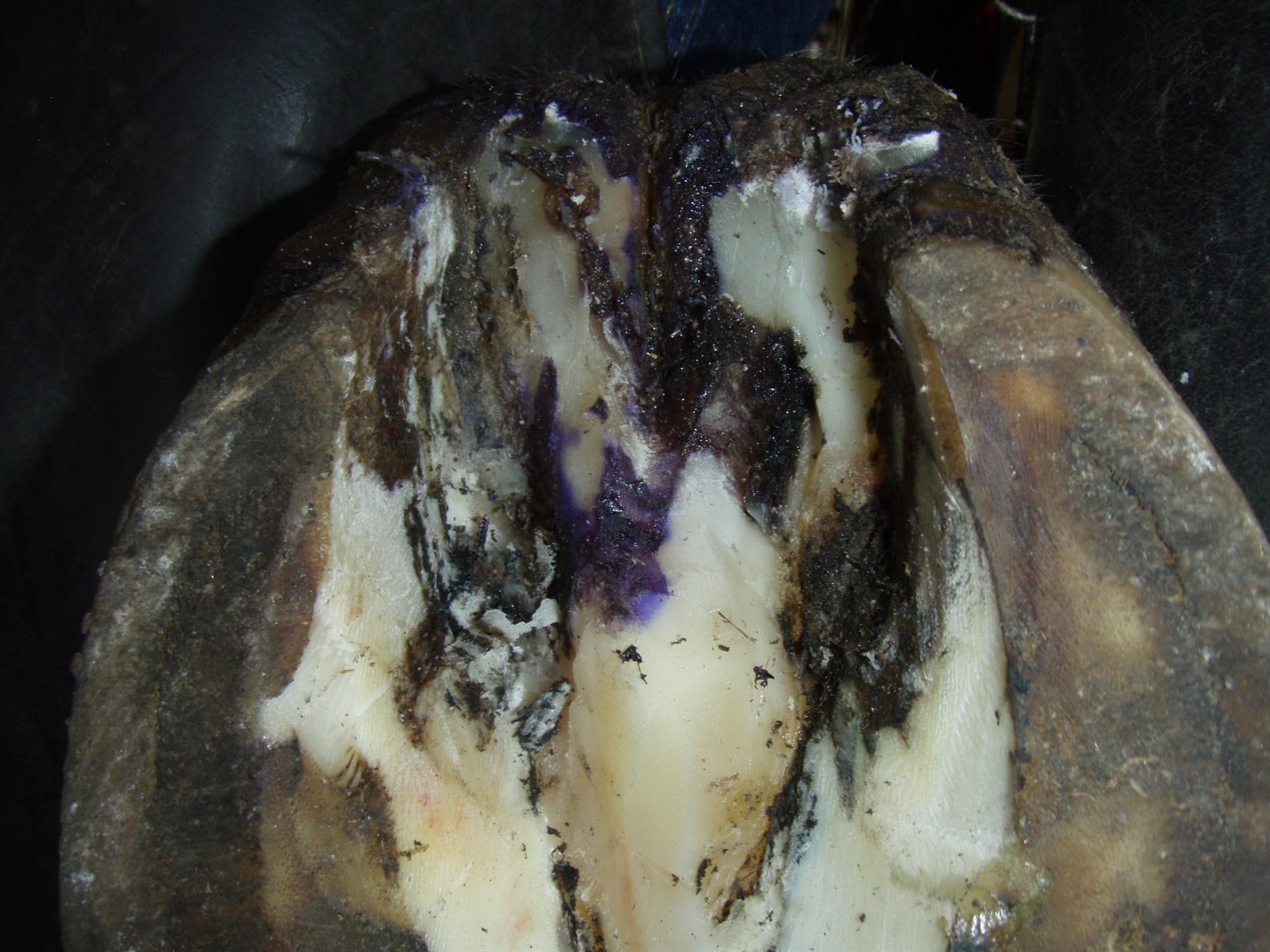The most common source of really severe thrush is in the cleft between the heel bulbs, called the central sulcus, which runs down the center of the frog. In some cases, thrush can create a deep gash there that can be cleaned out with gauze and antiseptics as part of the treatment, Fraley said.