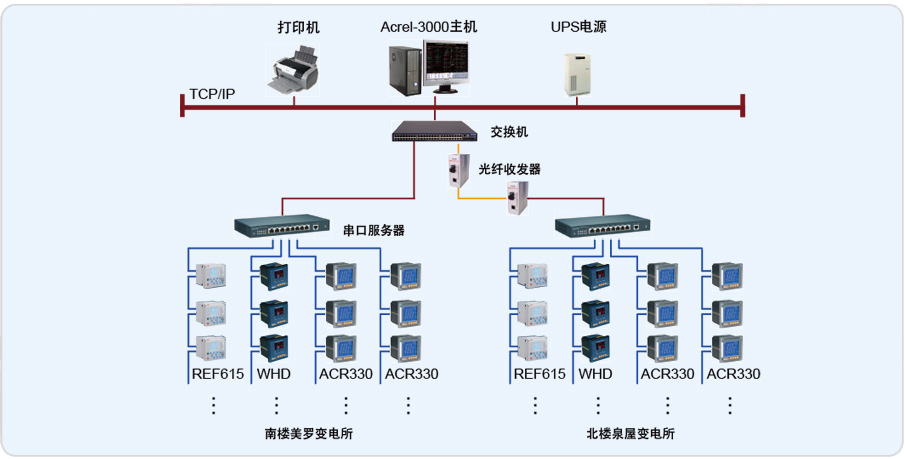 该系统总计有352只仪表(其中包括330只ACR网络多功能电力仪表,12只ABB综合保护装置,10只变压器温控仪),分20条总线,其中北楼泉屋变电所8条总线,南楼美罗变电所12条总线,两变电所之间距离较远,采用光纤组网连接,再通过网线拉至南楼美罗变电所值班室连接到监控主机实现总线上仪表与监控主机的数据连通。