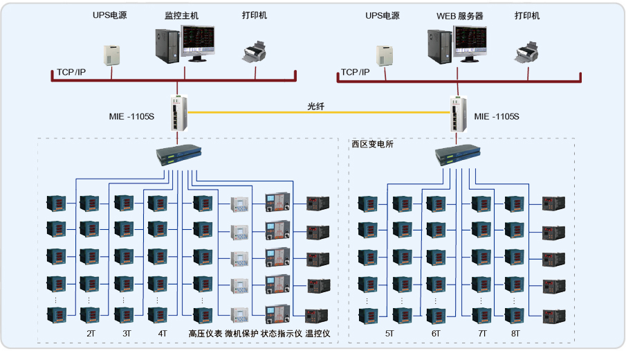 系统总计有219只仪表(其中包括187只ACR网络智能电力仪表,10只ABB综合保护装置,14只高压开关状态指示仪,8只温控仪),分13条总线,其中东区变电所8条总线,西区变电所5条总线,两变电所之间距离较远,采用光纤组网连接,再通过网线拉至电工值班室连接到监控主机实现总线上仪表与监控主机的数据连通。